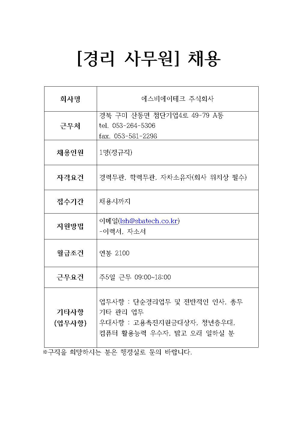 에스비에이테크 주식회사 채용정보