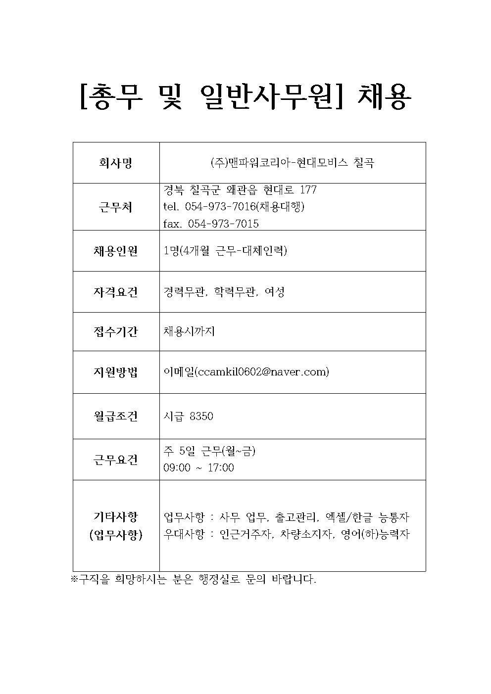 (주)맨파워코리아-현대모비스 칠곡 채용정보