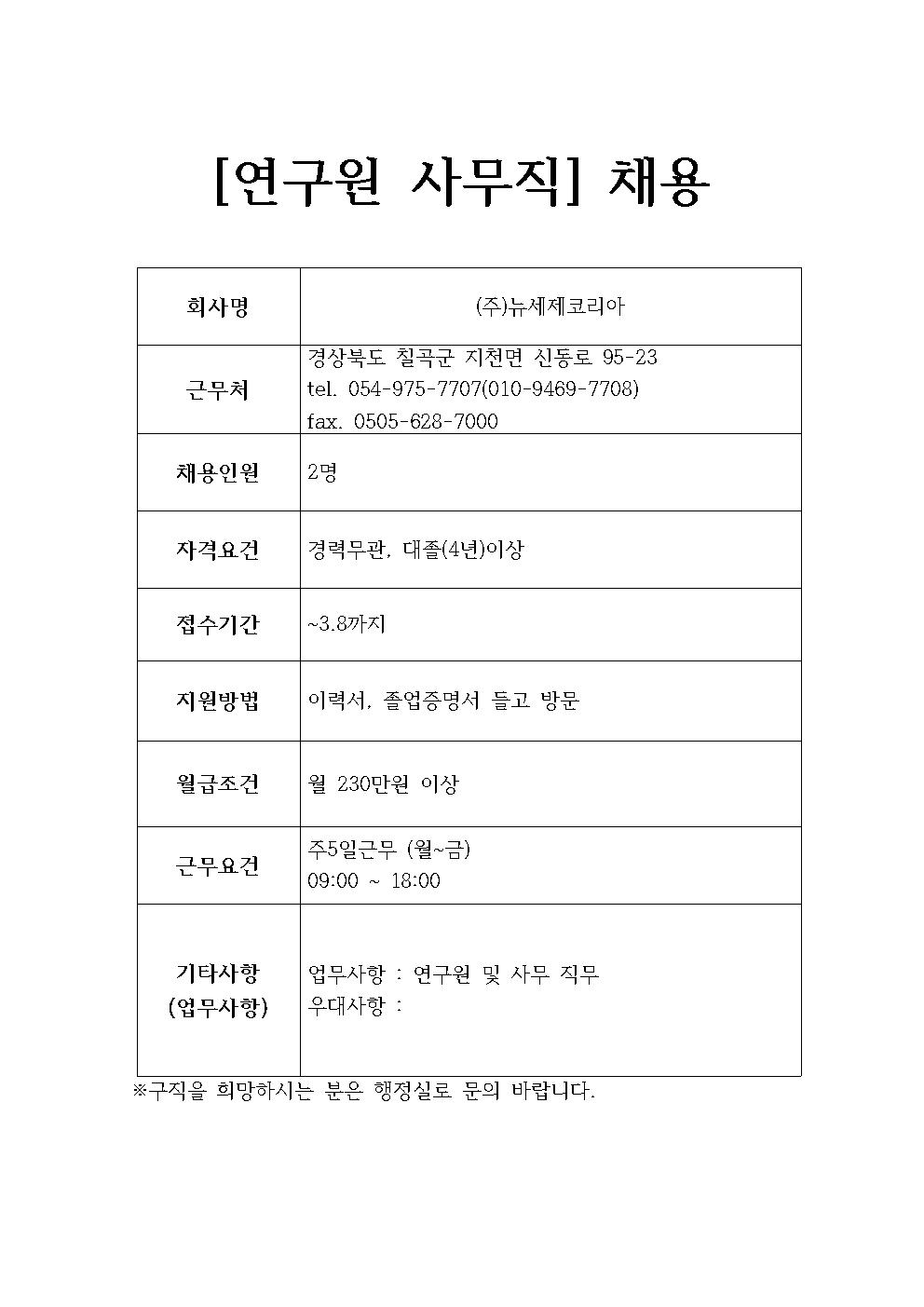 (주)뉴세제코리아 채용정보