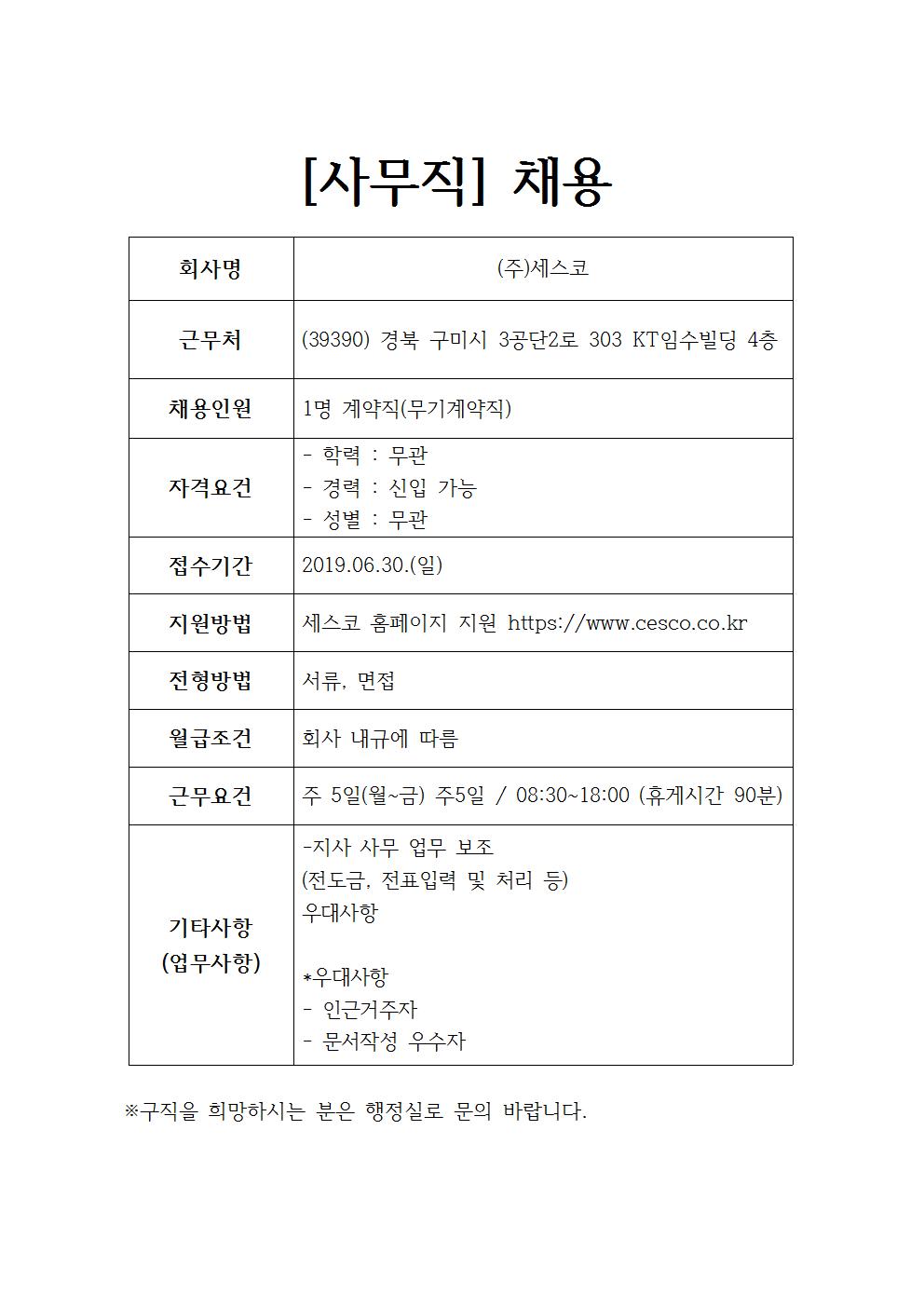 (주)세스코 채용공고