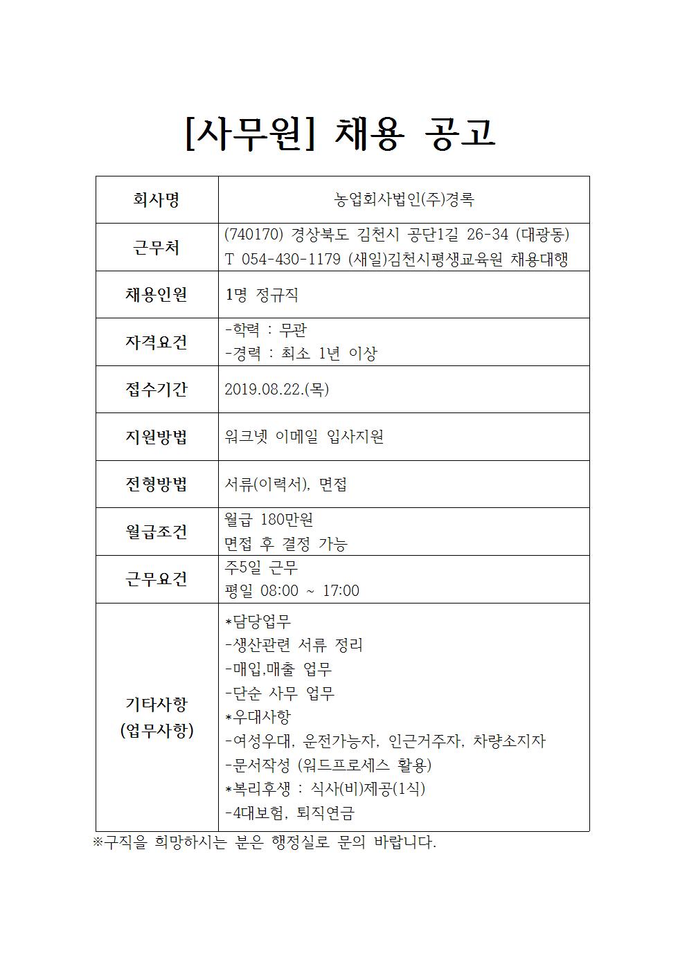 농업회사법인(주)경록 채용공고