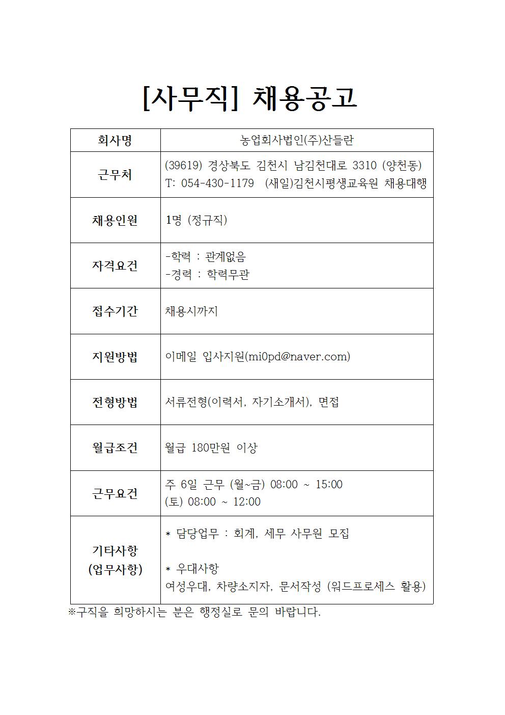 농업회사법인(주)산들란 채용공고