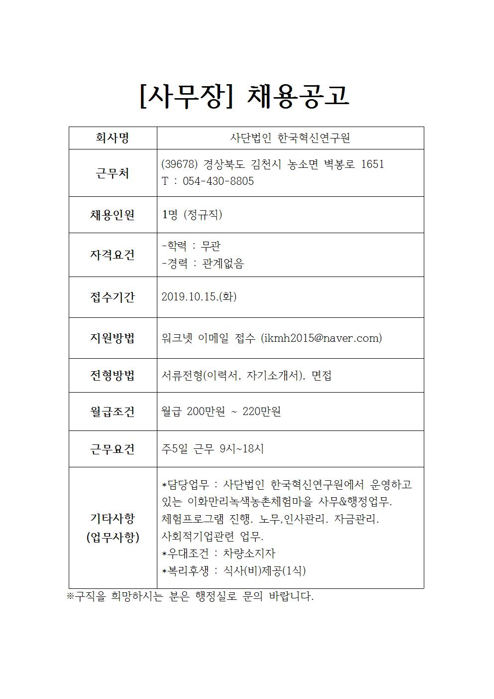 사단법인 한국혁신연구원 채용공고