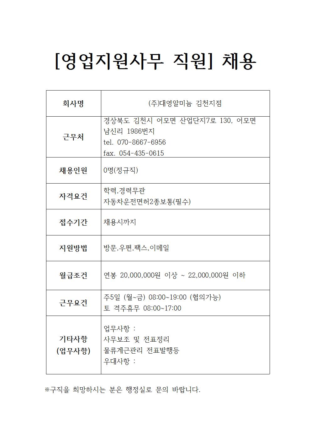대영알미늄김천 채용정보