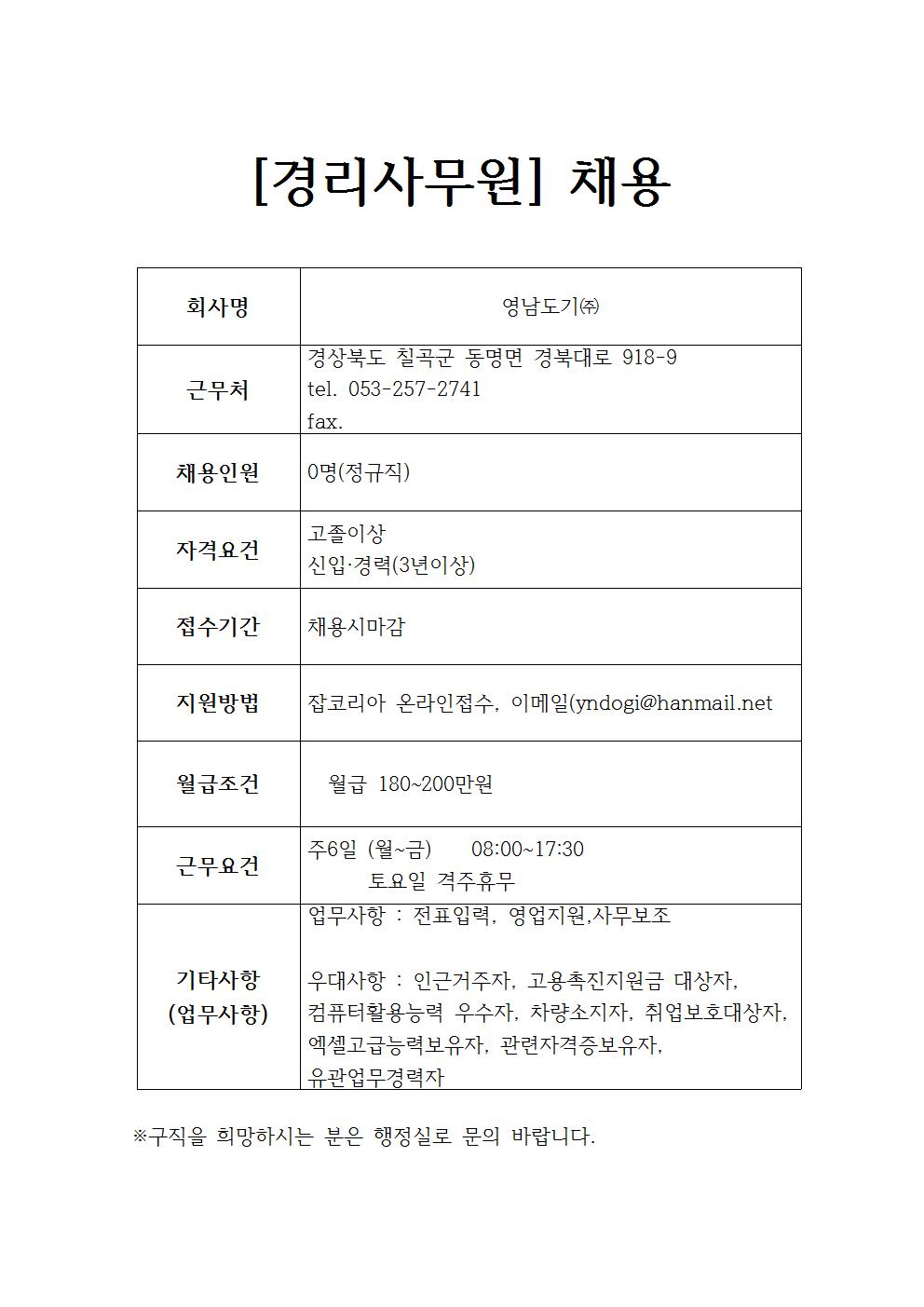영남도기㈜ 채용정보