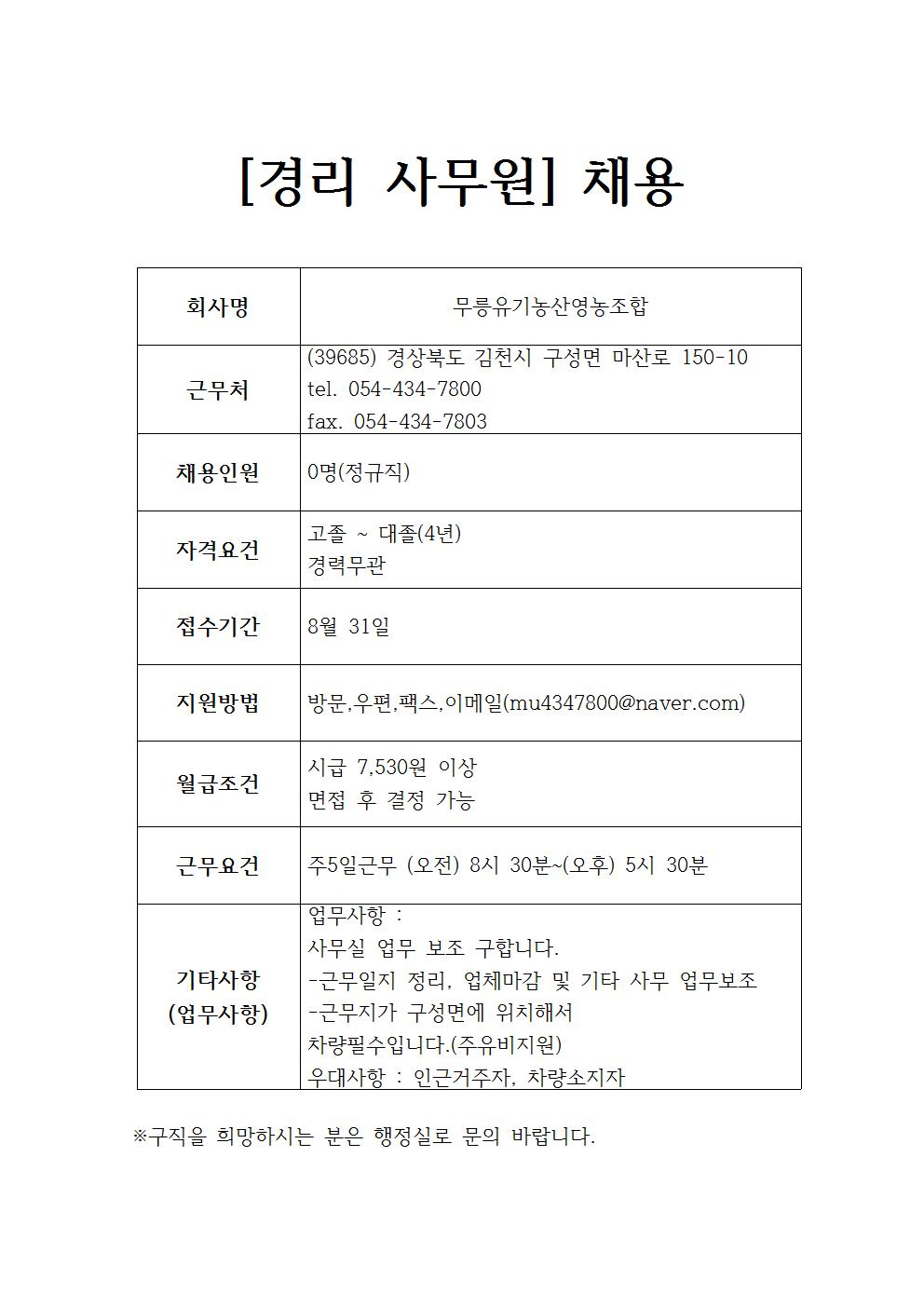 무릉 유기농산 영농조합 채용정보