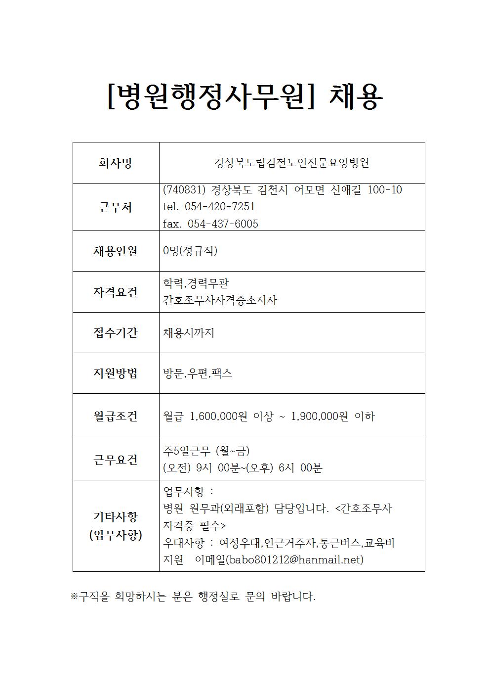 경상북도립 김천노인전문요양병원 채용정보