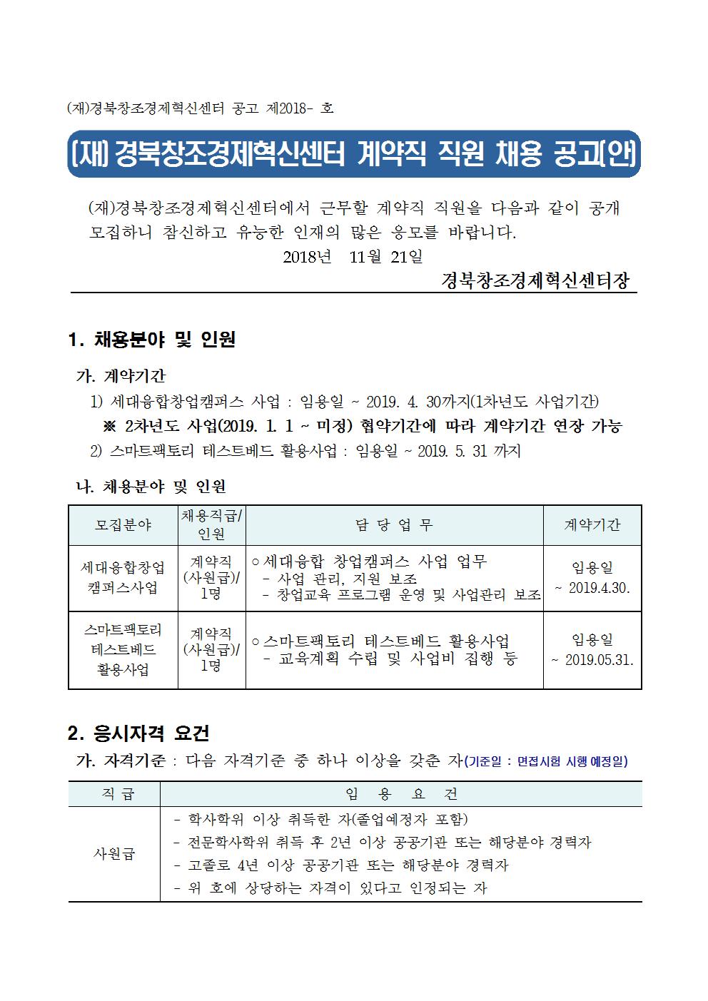 (재)경북창조경제혁신센터 계약직 직원 채용정보