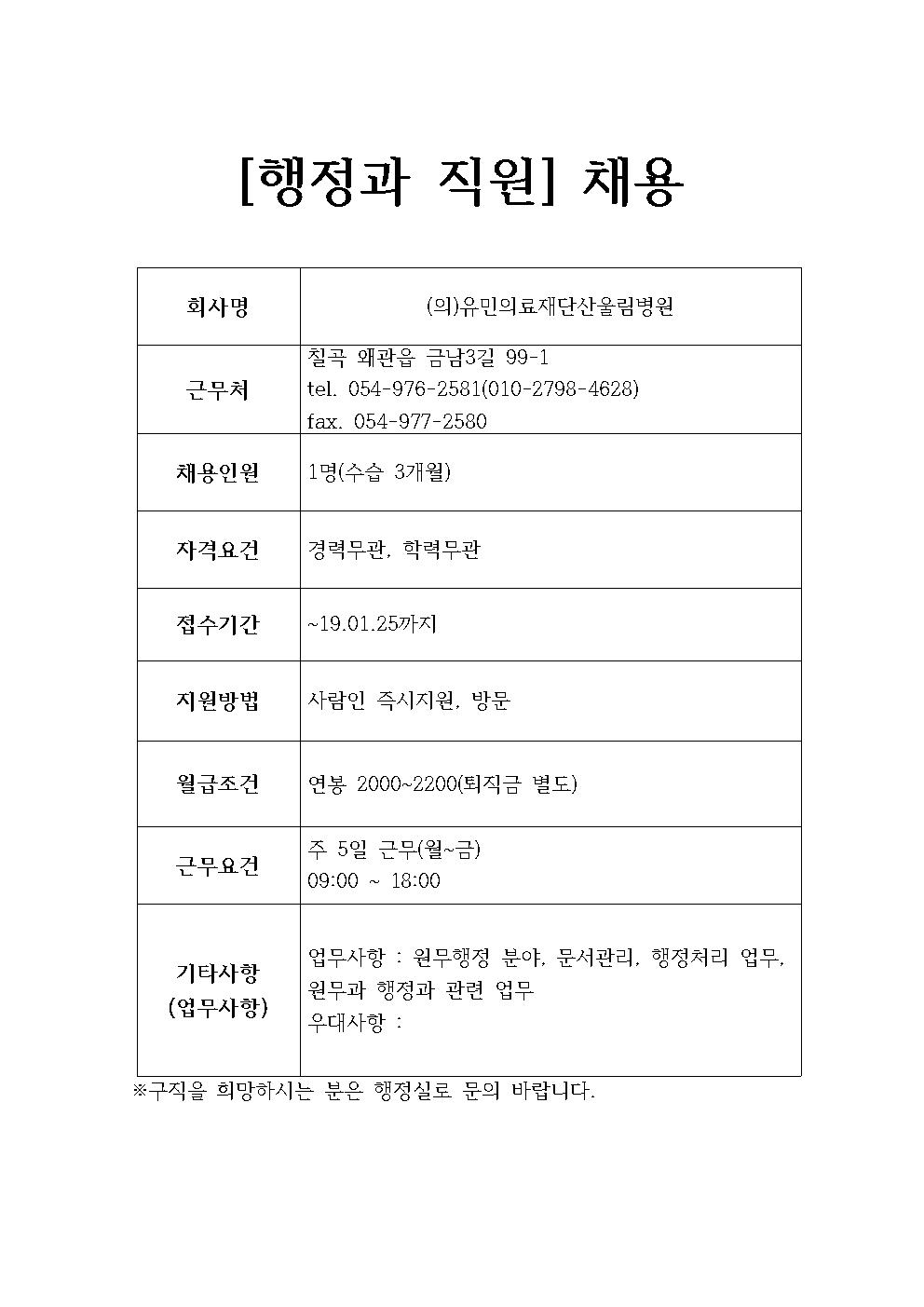 (의)유민의료재단산울림병원 채용정보