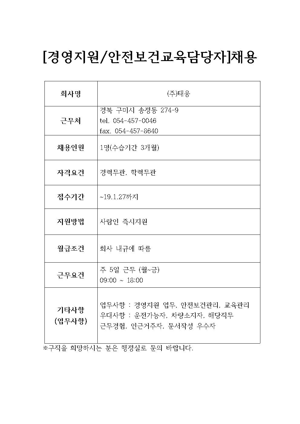 (주)태웅 채용정보(경영지원, 안전보건/교육관리)