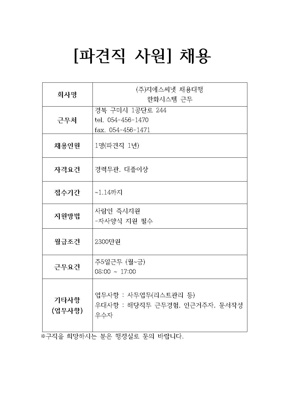 지에스씨넷-한화시스템 채용정보