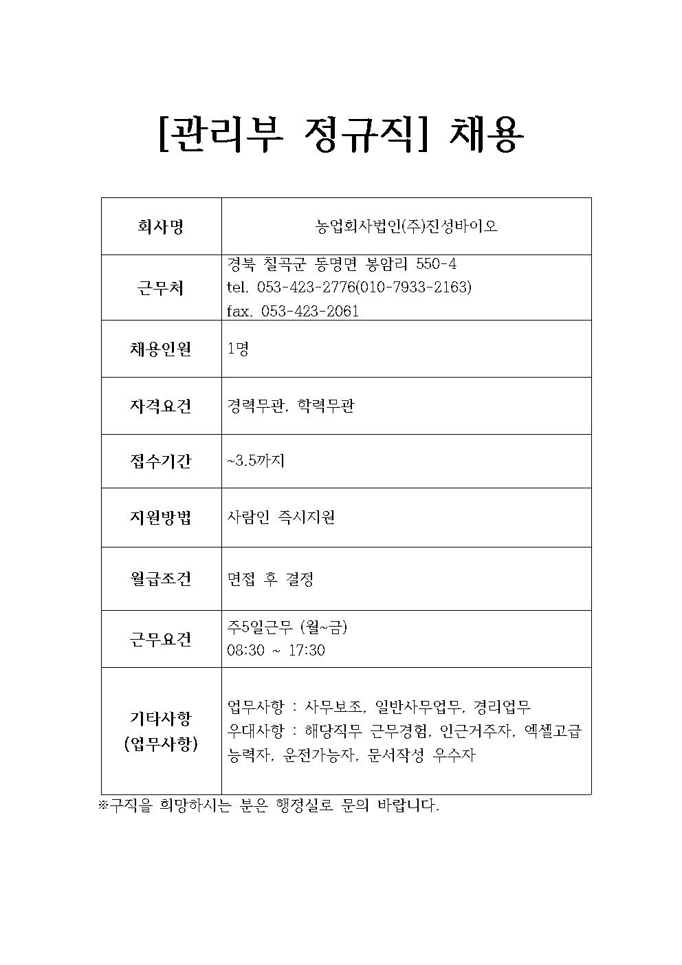 농업회사법인(주)진성바이오 채용정보