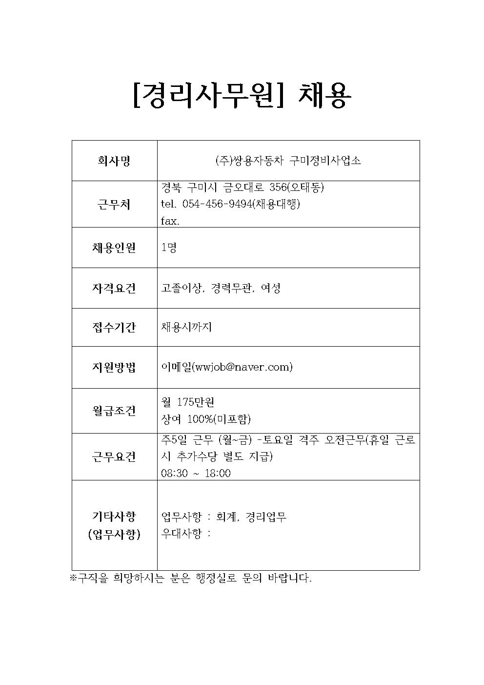 (주)쌍용자동차 구미정비사업소 채용정보