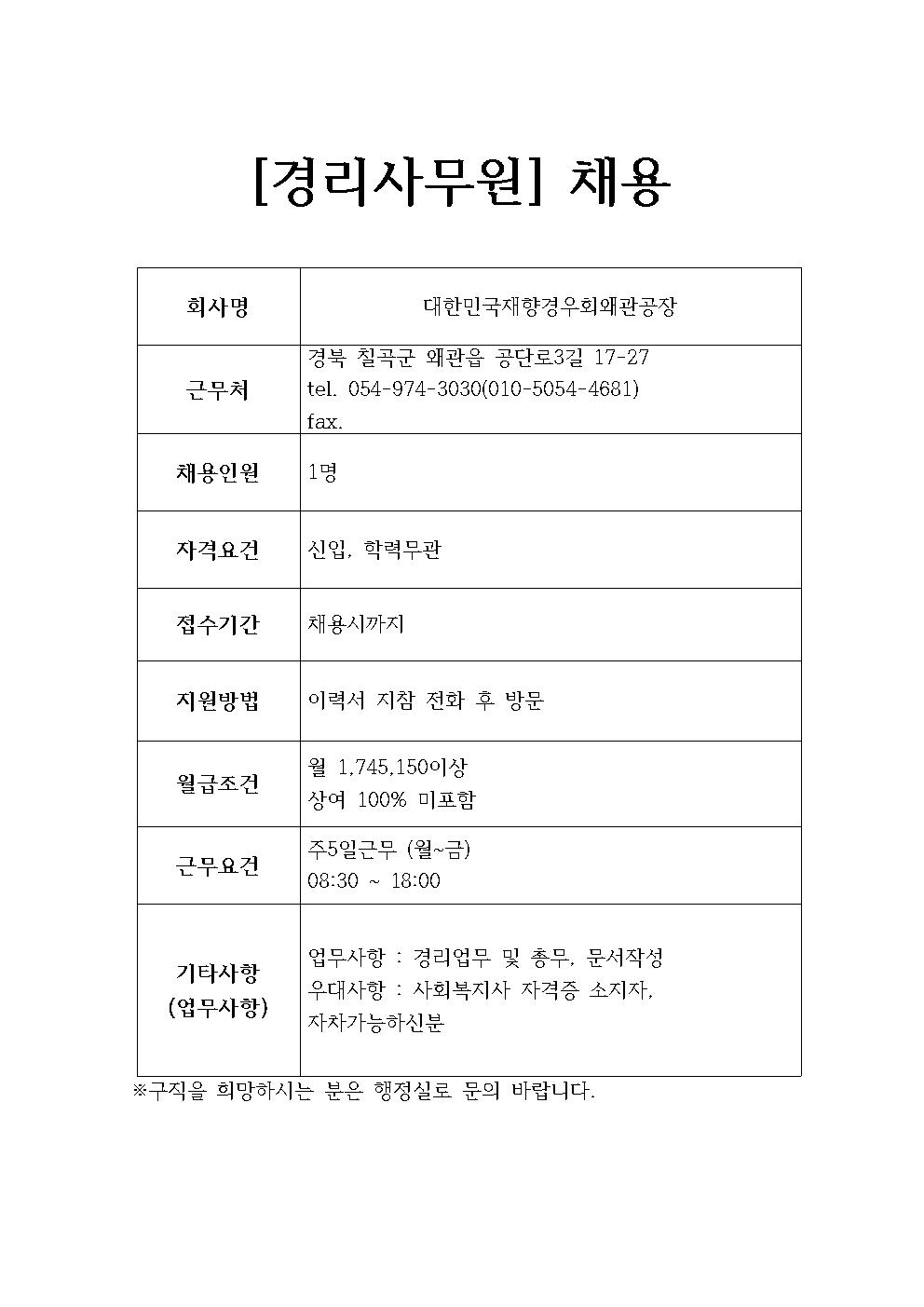 대한민국재향경우회왜관공장 채용정보