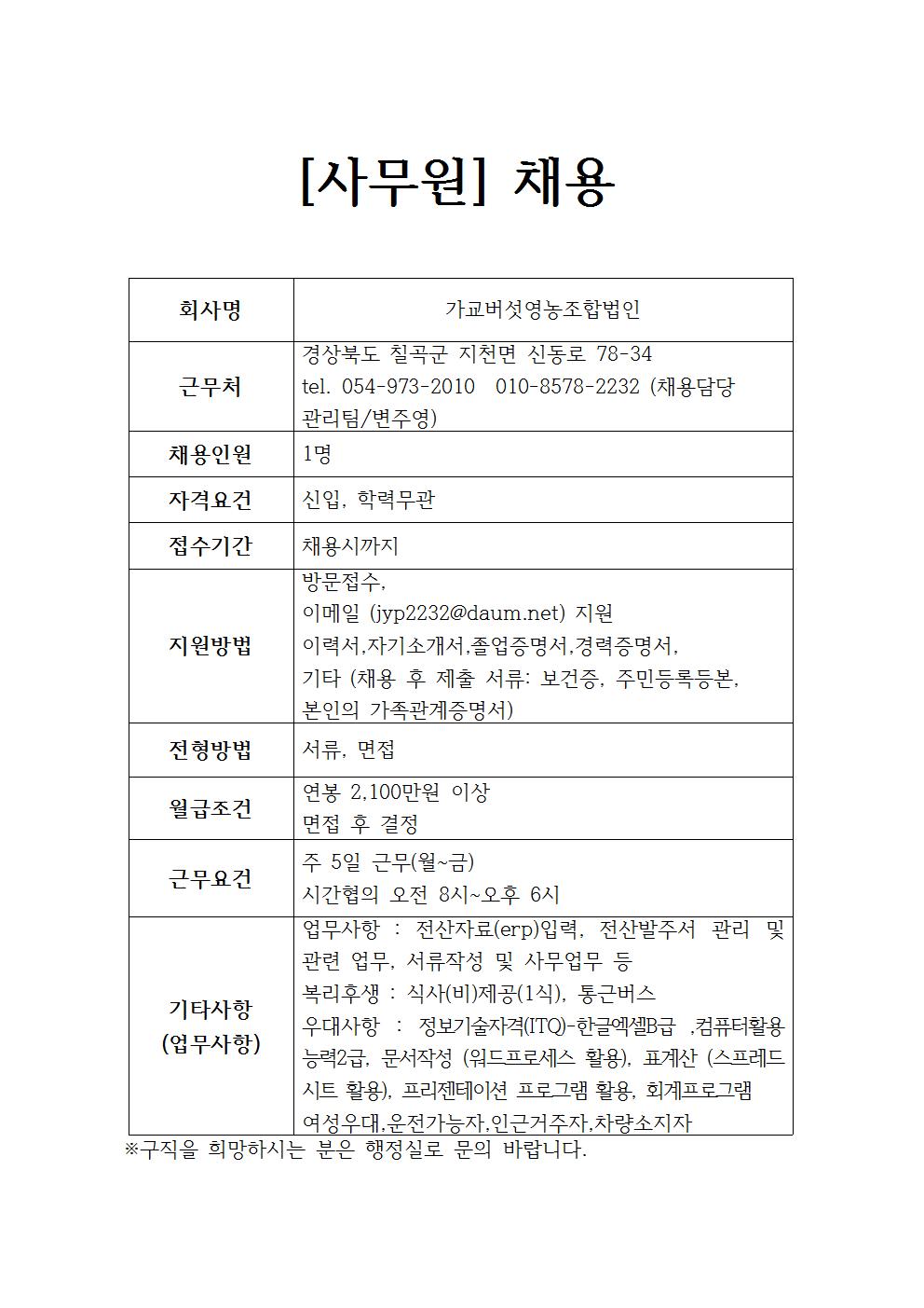 가교버섯영농조합 채용정보