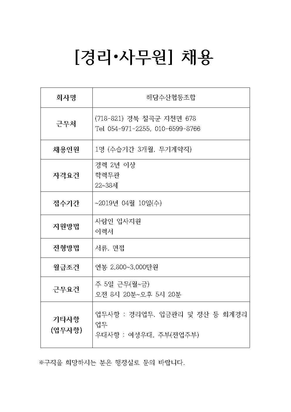 해담수산협동조합 채용공고