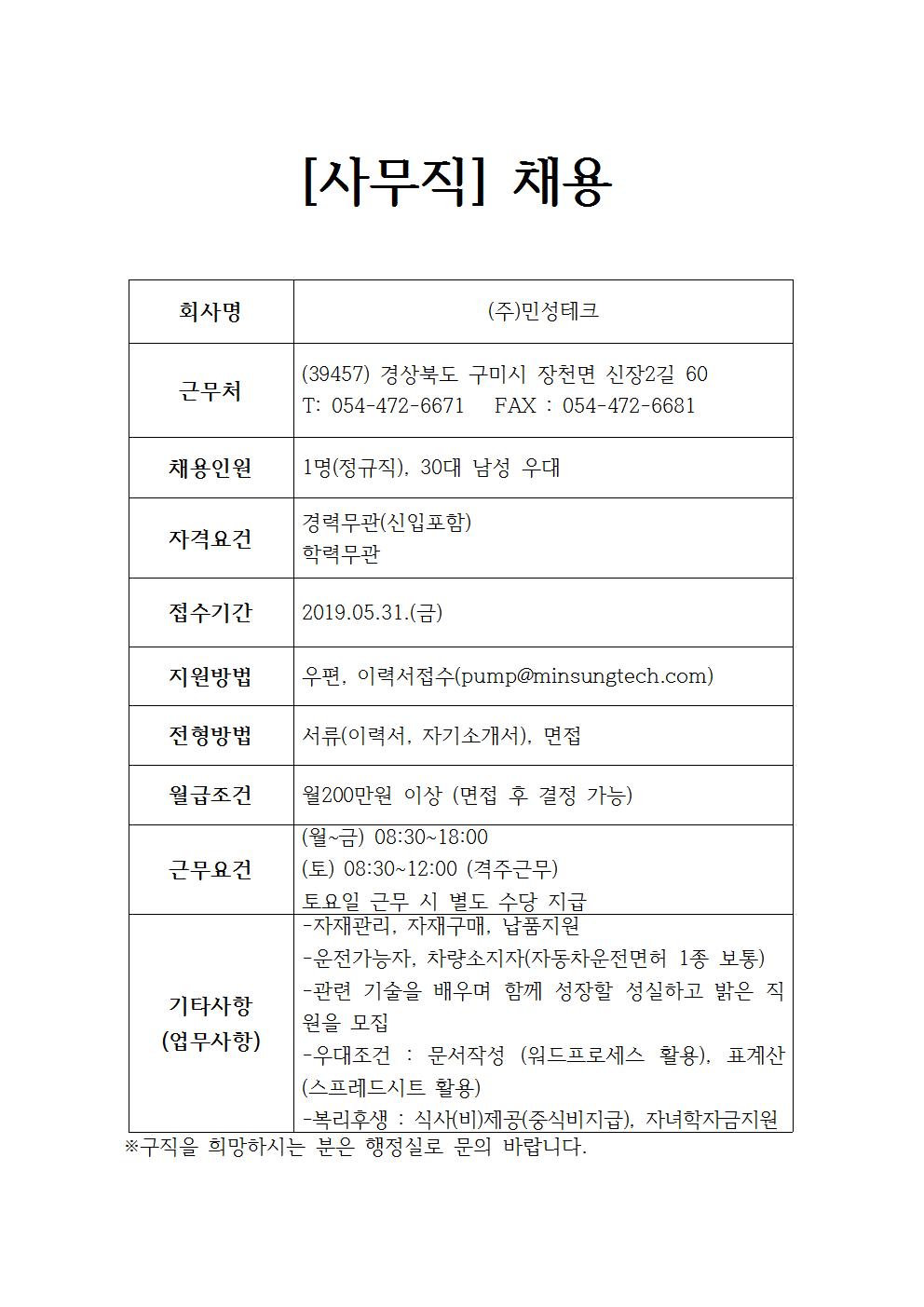 (주)민성테크 채용공고
