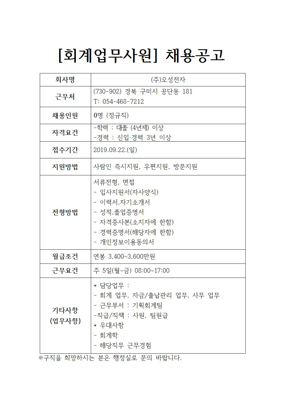 (주)오성전자 채용공고